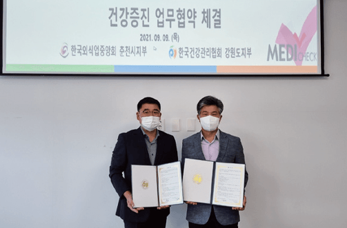 강원지부는 9. 9.(목) 춘천외식업중앙회와 건강증진 서비스 업무협약을 체결했다. 이번 협약을 통해 양자 간 상호 신뢰를 바탕으로 유기적 연대 관계를 확립했으며, 한국외식업중앙회 임직원에게 건강증진 서비스를 제공함으로써 상호 지속적인 발전을 위해 노력하기로 했다.