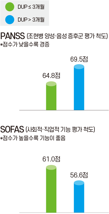 정신질환 발생 후 치료받기까지 기간이 짧을수록 정신병적 증상이 덜했고, 사회적·직업적 기능이 더 좋은 것으로 나타났다.