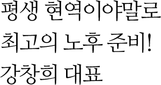 특히 아직 노후 준비를 시작하지 못한 50~60대에게는 자녀는 우리의 노후를 보장하지 않으니 자녀 지원에 신중할 것을 권했다. 또 무리한 재테크로 자산 증식을 노리기보다는 주어진 상황에 맞춰서 살아갈 수 있도록 노력해야 한다고 조언하며 그렇기에 평생 현역이야말로 최고의 노후 준비임을 다시 한번 강조했다. 최근 저서 『오십부터는 노후 걱정 없이 살아야 한다』를 발간하고 각종 강연과 방송 활동, 연금포럼 대표 활동으로 바쁜 나날을 보내고 있는 강창희 대표. 열심히 일하는 것이 건강 유지의 비법이라고 생각한다는 강 대표는 가까운 곳은 의식적으로 걸어 다니며 하루에 한 시간은 꼭 걷는다. 보험을 잘 준비하고 꾸준히 건강검진을 받는 것도 건강을 지키는 방법이다. 체력과 건강이 허락하는 한 노후설계 교육과 투자교육을 계속해나가는 것이 그의 목표다.