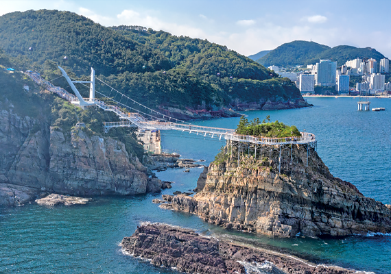 바다 경치를 보고 싶다면 송도용궁구름다리를 권한다. 자갈치시장 기준으로 설명하면 그렇게 멀지 않은 곳에 있다. 송도용궁구름다리는 암남공원에서 바다 건너 작은 무인도 동선 상부를 연결하는 길이 127m의 해상 다리다. 다소 아찔할 수 있다. 철제다리 위로 바다를 공중 산책하는 듯한 기분을 느낄 수 있기 때문이다. 따라서 고소공포증이 심한 분에게는 비추…는 아니고 사실 그렇게까지 무섭지는 않다. 충분히 건널 수 있는 수준이다. 이곳에 가면 송도를 한눈에 담을 수 있고, 멋진 각도로 펼쳐진 암남공원의 기암절벽도 볼 수 있다. 뭘로 보나 ‘경치빨’ 제대로 만끽할 수 있는 곳이다. 음악은 글에서 이미 힌트를 제시했다. 애니메이션 <하울의 움직이는 성> 수록곡 ‘공중 산책’이다. 다리 건널 때 꼭 이 곡을 검색해서 들어보자.