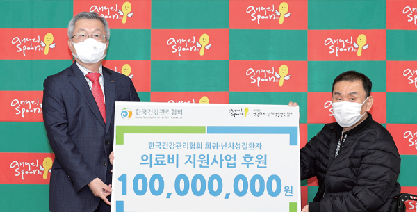 한국건강관리협회는 11. 15.(월) 한국희귀·난치성질환연합회를 방문해 희귀·난치성질환으로 고통받는 환우와 그 가족을 위해 의료비 1억 원을 전달했다. 이날 전달식에는 건협 채종일 회장, 한국희귀·난치성질환연합회 김재학 부회장, 정진향 사무총장 등이 참석했다. 전달된 의료비는 고가의 의료비 부담 등 경제적 상실로 인한 환우 및 가족들의 실질적 어려움을 완화하고 건강 증진을 돕는데 사용된다. 건협은 지난 2018년부터 희귀·난치성질환자를 위해 3년째 후원을 이어나가고 있다.