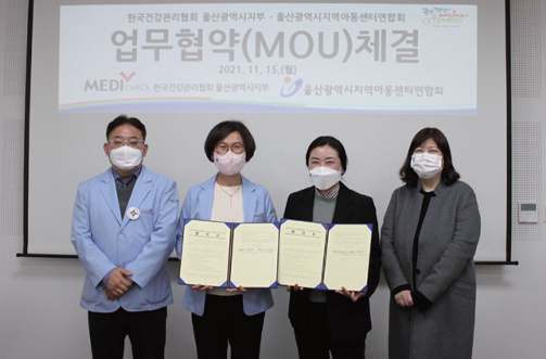 울산지부는 11. 15.(월) 지부 7층 회의실에서 울산광역시아동센터연합회와 사회공헌사업 지원을 위한 업무협약식을 가졌다. 이번 협약을 통해 양 기관은 울산지역 아동청소년의 아동복지 향상과 소외계층에 다양한 나눔사업지원 및 다양한 분야의 협력사업 지원을 약속하고 건강문화 조성을 위한 상호 협력을 다짐했다.