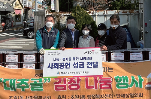 경기지부는 11. 16.(화) 수원시 조원1동 행정복지센터에서 진행된 김장 나눔 행사에 참여하여 김치 담그기와 사회공헌 성금을 전달하였다. 갑작스러운 추위와 코로나 19로 어려움을 겪고 있는 이웃들에게 사랑과 정성이 가득 담긴 김장 김치를 전달함으로써 더욱 건강한 겨울을 보내기를 기원하였다. 경기지부는 앞으로도 실질적인 도움과 온정의 손길로 다양한 사회공헌 나눔활동을 이어나갈 것이다.