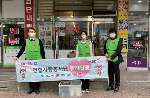 충북세종지부 직원들은 11. 29.(월) 운천동에 있는 청주종합사회복지관을 찾아 봉사활동을 펼쳤다. 이번 봉사는 생활이 어려운 어르신들을 위하여 반찬을 직접 배달하는 활동이었다. 충북세종지부는 정기적인 봉사활동 외에도 의료소외계층을 위한 건강검진, 물품 및 성금 기탁 등 사회소외계층에 대한 나눔 문화 확산을 위해 다양한 사회공헌사업을 펼치고 있다.