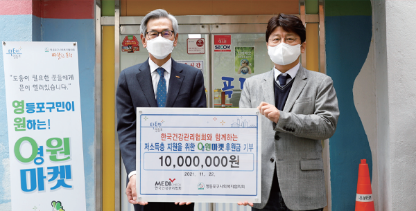 한국건강관리협회는 11. 22.(월) 영등포구사회복지협의회를 방문해 영원마켓 후원금 1,000만 원을 전달했다. 영원마켓은 생계가 어려운 구민들에게 꼭 필요한 생필품 5개 품목을 무상으로 지원하는 무료 마켓이다. 이날 전달식에는 건협 조재현 사무총장과 최상철 홍보기획실장, 영등포구사회복지협의회 박영준 회장과 박래찬 사무국장 등이 참석했다.