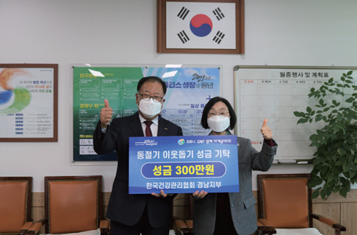 경남지부는 11. 22.(월) 코로나19로 어려움을 겪는 이웃들이 따뜻한 겨울을 보내길 바라며 창원시에 사랑의 성금을 전달하였다. 이번 성금은 지역 내 위기가정에 전달될 예정이다. 경남지부는 따뜻한 사랑 나눔을 위해 다양한 사회공헌활동을 펼치고 있다.