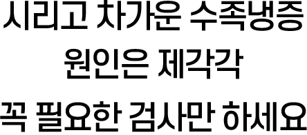 수족냉증은 진단명이 아니라 환자의 증상이기 때문에 원인을 찾는 검사가 반드시 필요하다. 가장 흔한 원인은 혈액순환장애이지만 이상감각을 느끼게 하는 말초신경 질환, 체온을 떨어뜨리고 대사장애를 일으킬 수 있는 갑상선 질환, 자가면역장애로 인한 류머티즘성 질환, 경추와 요추의 협착증이나 디스크 등도 수족냉증의 원인 질환일 수 있다. 하지만 모든 질환을 감별하기 위해 각 질환에 해당되는 검사를 다 할 수는 없기 때문에 진찰을 통해 의심할 만한 원인부터 검사를 진행하는 것이 좋다.