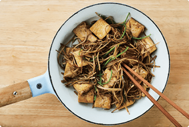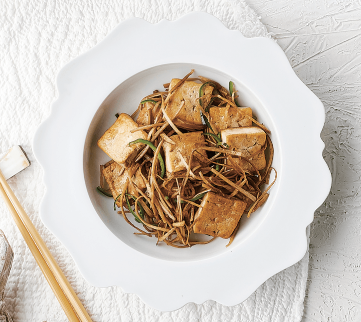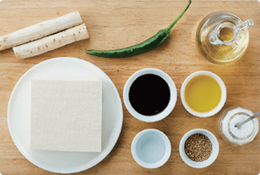 ④ 프라이팬에 들기름을 두르고 우엉을 넣고 부드러워질 때까지 볶다가 간장, 물엿을 넣어 간을 맞춘 후 ②의 두부와 채 썬 풋고추를 넣어 볶아 완성한다.