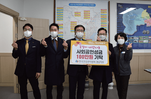 남지부는 지난해 12. 16.(목) 관내 어려움을 겪는 이웃들의 따뜻한 겨울 나기를 위하여 창원시 마산회원구청에 사랑의 성금을 전달했다. 이번 성금은 따뜻한 사랑나눔이 필요한 이웃에게 사용될 예정이다. 경남지부는 도움을 필요로 하는 이웃을 먼저 찾아가는 사회공헌활동을 지속적으로 실천하고 있다.