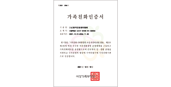 한국건강관리협회(이하 건협)는 지난해 12. 16.(목) 여성가족부에서 부여하는 가족친화기관 재인증을 획득했다. 가족친화인증은 우수한 가족친화경영 운영체계를 구축하고 가족친화제도를 운영함으로써 근로자의 일·생활 균형을 지원하고 국가경쟁력 향상에 기여한 기관에 부여하는 제도다. 건협은 2013년부터 지속적으로 인증받고 있다.