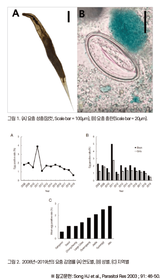 요충은 세계적으로 가장 흔한 장내 선충으로 주로 어린이(5~14세)에게 유행하는 기생충 감염증이다. 요충의 성충(암컷)은 하단부가 뾰족하며 수면하는 동안에 항문 밖으로 기어 나와 항문 주위에 충란을 산란한다(그림 1). 요충증은 일반적으로 무증상이긴 하나 항문 가려움증, 복부 불편감등을 초래하기도 하며 충란에 오염된 물체(장난감, 문손잡이, 이불 등)나 감염자와의 접촉으로 충란이 경구를 통해 감염된다. 요충증은 재감염되기 쉬워 가족 또는 유치원 등 구성원 전원을 동시에 치료하는 것이 중요하며 손씻기, 손톱 자르기 등 개인위생 및 주변 환경을 청결하게 유지하여 감염을 예방하는 것이 중요하다.