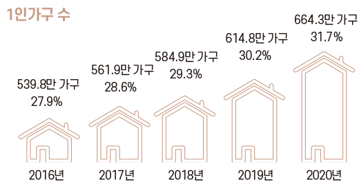 우리나라에서 혼자 사는 1인가구는 2020년 기준 664만 3,354가구로, 전체 가구수 대비 30%를 넘는다.