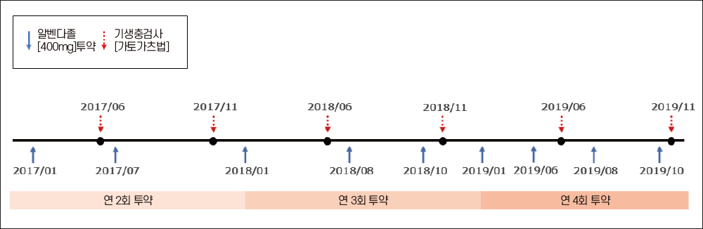 그림 1. 알벤다졸 투약 및 기생충 검사 시기 모식도