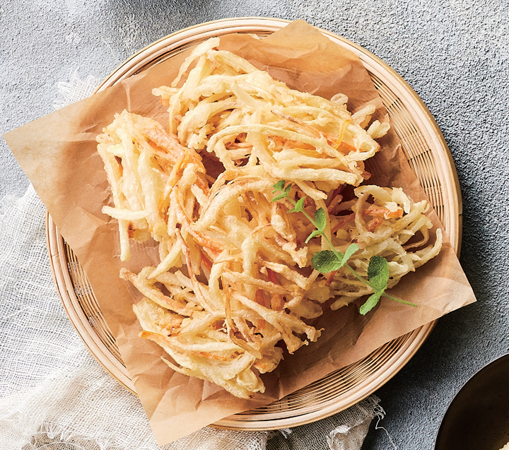 ⑤ 튀김 팬에 식용유를 적당량 넣고 채소 반죽을 한 젓가락씩 떼어 넣고 노릇하게 튀긴다.
