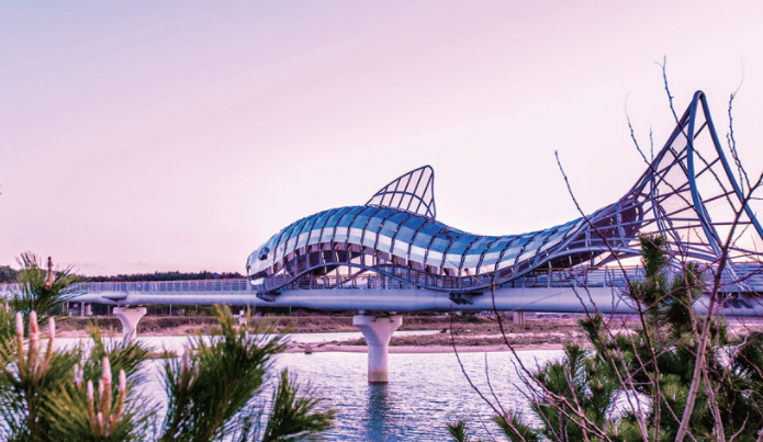 울진 담대천 하류에 있는 은어다리는 산란철에 회귀하는 은어를 본따 만들었다. 은어 두 마리가 마주 보고 있는 형상의 이 다리는 해가 지고 어둠이 내리면 더욱 장관이다. 반짝거리는 조명이 켜지고 형형색색의 빛을 뿜어내니 신비로운 느낌마저 감돈다. 시간에 따라 여러 빛깔로 바뀌는 은어다리를 보는 것만으로도 이색체험을 한 기분이 들 것이다.
