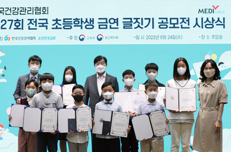 한국건강관리협회는 8. 24.(수) 본회 추담홀에서 제27회 전국 초등학생 금연글짓기 공모전 시상식을 개최했다. 이날 시상식에서는 서울 대치초 3학년 김도형 군과 서울 영중초 6학년 임지후 군이 저·고학년부 대상(보건복지부·교육부장관상)을, 서울 광운초 2학년 김현도 군과 남양주 화도초 5학년 유다현 양이 금상을 수상했다. 한편 이번 공모전에는 총 9,143편이 접수됐으며, 이 중 942편이 수상했다.