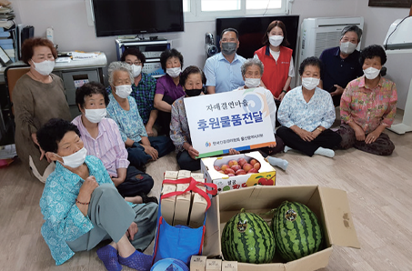 울산지부는 8. 11.(목) 자매결연을 맺은 상회마을에 무더위와 코로나19를 이겨나가는 데 조금이라도 도움이 되기를 바라는 마음을 담아 ‘여름철 더위 날리기 후원물품’을 전달했다. 울산지부는 매년 농번기 일손이 부족한 상회마을 농가에 보탬이 되고자 일손돕기 나눔 봉사활동과 지역마을 행사 참여는 물론 후원 물품 등을 적극적으로 후원하고 있다. 앞으로도 자매결연 마을과 지속적으로 교류하며 유대관계를 강화하고 다양한 건강증진서비스도 지속적으로 제공할 예정이다.