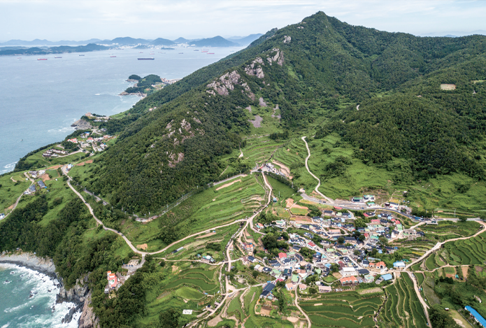 초록의 비탈진 계단 위로 긴 노동의 시간이 멈춘 듯한 다랭이마을은 45도 경사 비탈에 108개 층층 계단 680여 개 논이 펼쳐져 있다. 다랑이가 표준말로, 산골짜기의 비탈진 곳 따위에 있는 계단식의 좁고 긴 논배미란 뜻인데 남해 사투리로 ‘다랭이’라고 부른다. 농토를 한 뼘이라도 더 넓히려고 산비탈을 깎아 만든 계단식 논이기에 아직도 소와 쟁기가 필수다. 남해 가천마을 다랑이논은 2005년 1월 3일 국가 명승 제15호로 지정되었다. 바다에서 시작된 좁고 긴 논들은 계단처럼 이어져 있고, 남해 최고의 산행길로 사랑받는 응봉산과 설흘산을 향하고 있다. 자연 그대로에 감사하며 척박한 땅을 일구며 살았던 선조들의 억척스러움이 지금까지 이어지고 있는 삶의 현장이기도 하다.