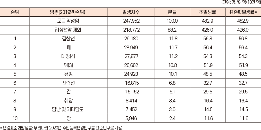 국가암정보센터의 최신 자료에 따르면(2020년 기준), 가장 많이 발생한 암은 갑상선암이고, 이어서 폐암, 대장암, 위암, 유방암, 전립선암, 간암 순으로 나타났다. 특이할 만한 점은 2019년 기준 3위는 위암이었는데, 2020년 통계에서는 대장암과 순위가 바뀌어 대장암이 3위, 위암이 4위로 대장암 발병률이 더 높아진 점이다. 또 암관련 사망률이 높지 않은 갑상선암을 제외한다면 대장암은 폐암에 이어 두 번째로 높은 발병률을 나타냈다.