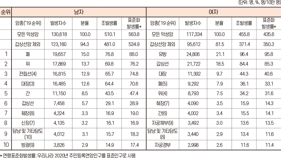 성별 주요 암발생 현황 2020