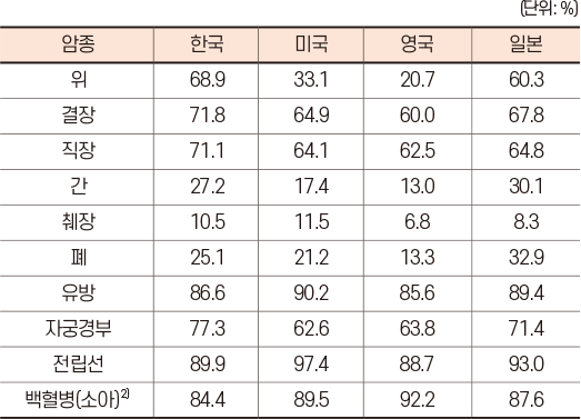주요 암의 5년 순 생존율 국제 비교