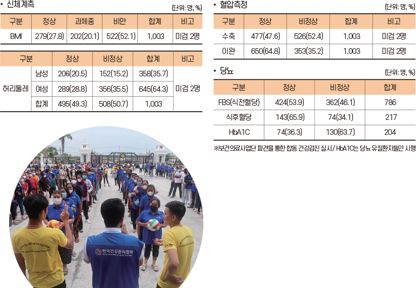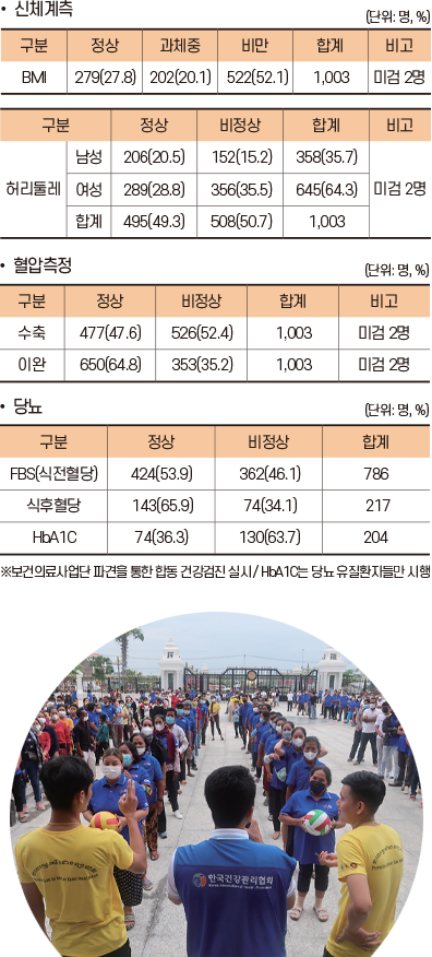 또 모바일앱을 개발해 비전염성질환 고위험군 300명을 추적·관리하고 지역주도형 건강생활습관 실천을 유도했다. 비전염성질환 예방 캠페인에는 사업유관기관 고위 관계자 13명, 지역주민 1,000여명이 참석했으며 캄보디아 뉴스 채널(CNC)에도 방영되며 뜨거운 관심을 받았다. 이밖에도 지역주민 1,968명을 대상으로 비전염성질환 관련 설문조사를 실시했으며(2022년 1,001명, 2023년 967명), 비전염성질환 고위험군 300명이 참여하는 건강생활클럽도 운영하고 있다.