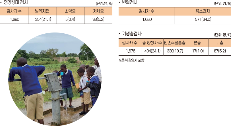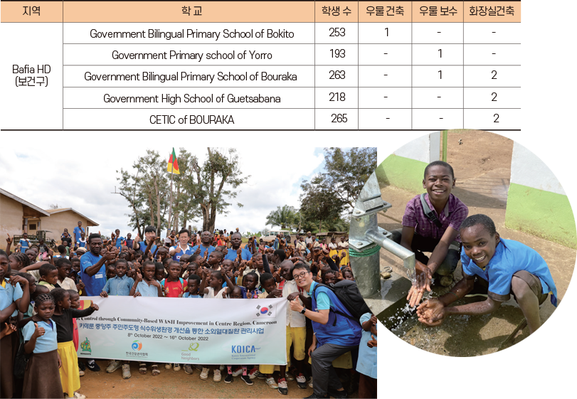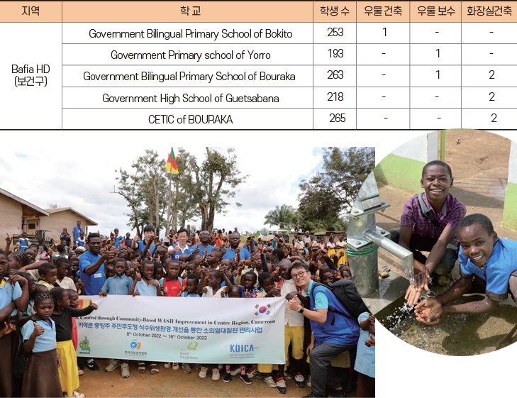카메룬 중앙주 Bafia 지역에는 기생충증 예방환경을 구축했다. 식수시설 3개, 화장실 6개의 신규 건축 및 개보수를 진행했으며 기생충 유병률 조사도 실시했다. 2, 3차년도 집단투약 및 기생충 유병률 조사계획이 협의되어 올 9월 성과관리 모니터링단을 파견할 예정이다. 또 카메룬 중앙주 14개 보건구역 약 67만 명을 대상으로 프라지콴텔 및 메벤다졸을 투약하고 구충약품 투약 담당자를 대상으로 부작용 관리 교육을 실시했다. 또한 초등학교 WASH 클럽 대상 손씻기 및 개인위생 교육, 세계 손씻기의 날 행사 개최를 통해 지역사회 위생 행동 확산 등 위생 행동 개선 교육도 실시했다.