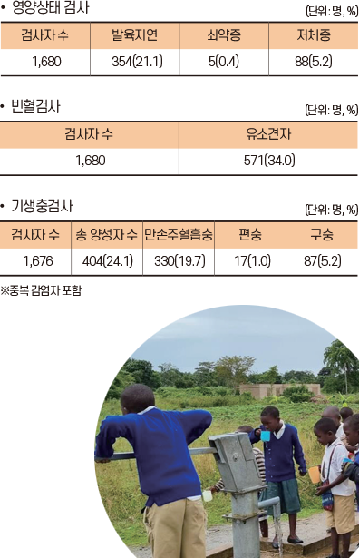 탄자니아 므완자(Mwanza)주 코메(Kome)에서는 초등학생 건강검진을 실시했다. 영양상태 검사, 빈혈검사, 기생충검사를 실시했으며 코메섬 12개 초등학교 14,005명에게 구충 약품을 투약했다. 또한 식수위생 인프라를 구축하고 관리시스템도 마련했다. 더불어 지역사회 정수시설 1개를 건축하고, 자치위원회를 구성해 분기별 1회 모니터링을 하고 있다. 이 외에도 학생 영양프로그램 지원사업을 통해 사업대상학교 12개교 14,005명에게 학교급식을 지원했으며 학교 및 지역정부 관계자 156명을 대상으로 역량강화교육도 실시했다. 올해 7월에는 기초선조사를 위한 모니터링단을 파견했다.