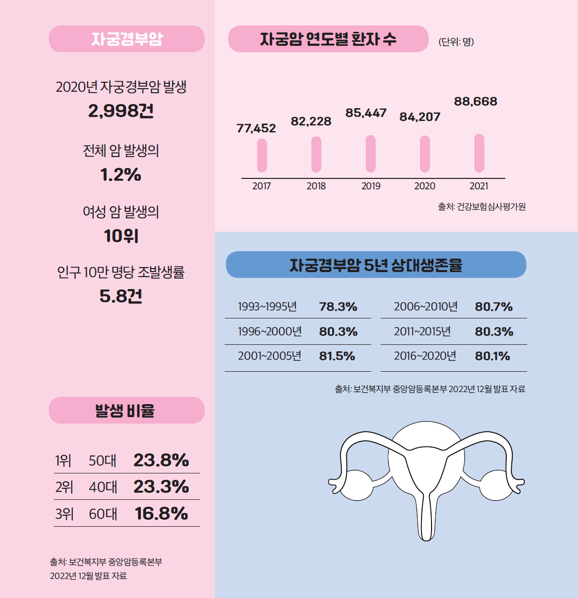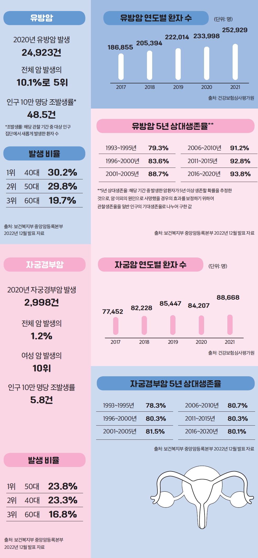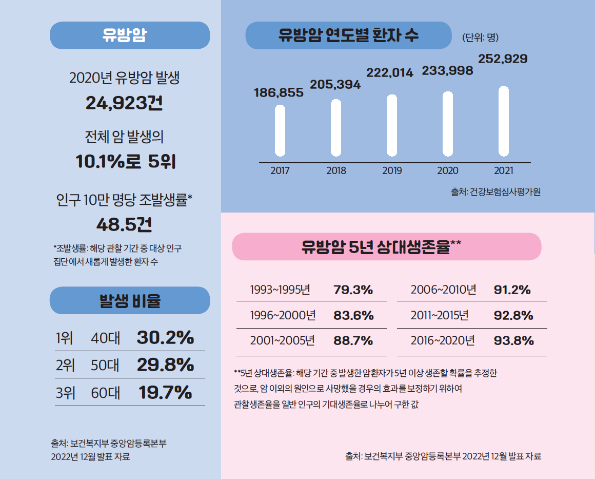 인구 고령화와 식습관, 생활습관의 변화로 암환자가 증가하는 추세다. 유방암과 자궁암도 예외는 아니다. 5년 상대생존율이 높아지고 있지만 조기발견과 완치를 위해서는 정기검진을 게을리 하지 않고 올바른 식습관과 생활습관을 갖춰야 한다.