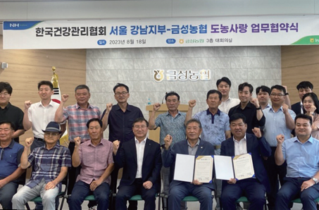 서울강남지부는 8. 18.(금) 금성농업협동조합과 상생협력을 통하여 지역경제 활성화와 지역농업 발전을 위한 지속적인 사회공헌활동을 수행하고자 도농사랑 업무협약을 체결했다. 이번 협약을 통해 두 기관은 사회공헌활동과 연계한 농촌재생활동 및 농촌자원을 연계한 지역경제 활성화를 위해 최선을 다할 것을 합의했다.