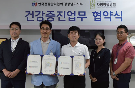경남지부는 8. 9.(수) 자연한방병원과 건강증진 업무협약을 실시했다. 이번 협약으로 경남지부는 자연한방병원 회원 및 가족 등을 대상으로 건강증진서비스를 제공하고, 지역주민의 삶의 질 향상을 위해 상호 협력하기로 약속했다. 경남지부는 앞으로도 지역 내 기관과 적극 교류하며 지역주민의 건강증진 및 지역사회 발전에 기여할 예정이다.