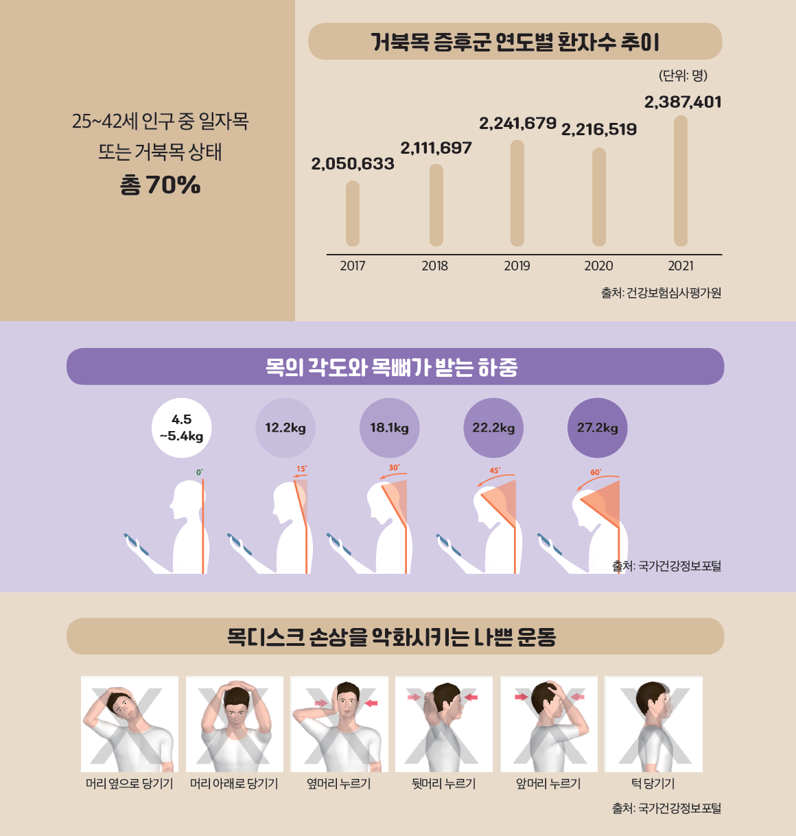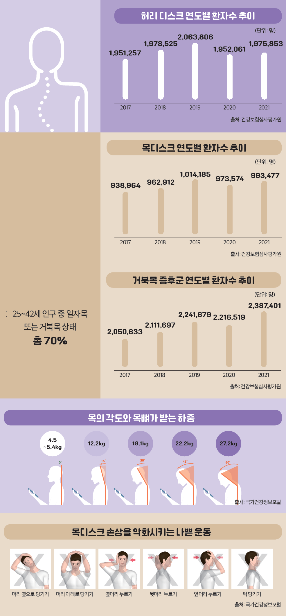 앉아서 생활하는 시간이 길어지고 각종 스마트 기기의 사용이 일상화되면서 경추와 척추 건강이 비상이다. 특히 거북목 증후군 환자의 증가 추세가 가파르고 20~40대 인구의 70%가 거북목 상태라는 연구결과도 있어 경각심을 가져야 한다.