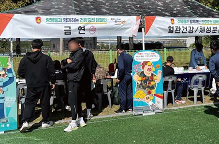 경기지부는 10. 6.(금) 육군 제55사단에 방문하여 장병 및 간부 대상으로 건강캠페인을 실시했다. 이날 캠페인은 55사단 전체 체육대회에 참여하여 체성분검사, 헤모글로빈 검사, 건강상담 등으로 이루어졌다. 앞으로도 경기도지부는 지역주민 뿐만아니라 다양한 주제의 건강강좌 및 건강캠페인을 이어나갈 것이다.