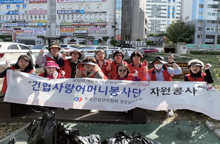 경남지부는 10. 11.(수) 노랑꽃창포 식재지인 창원천에서 직원 및 건협사랑어머니봉사단이 함께 건강환경가꾸기 활동을 실시하였다. 건강환경가꾸기는 사회공헌사업의 일환으로, 노랑꽃창포 식재지 주변 관리 및 유지보수를 위한 환경정화 활동을 진행하였다. 경남지부는 지역주민의 건강증진과 탄소중립실천을 위해 다양한 사회공헌활동을 지속해나갈 방침이다.