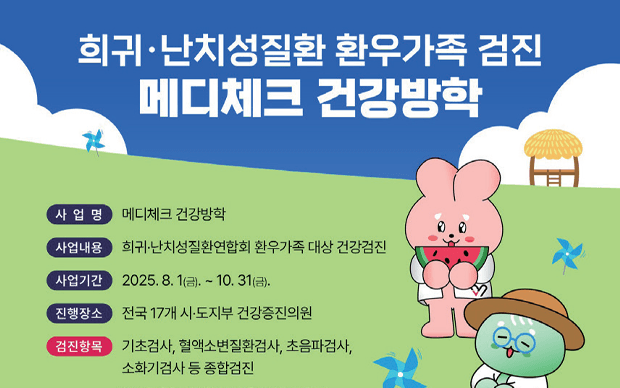 본부는 8. 1.(금)부터 10. 31.(금)까지 한국희귀·난치성질환연합회와 함께 환우 가족을 위한 ‘메디체크 건강방학’을 실시한다. 이번 검진은 간병 부담으로 건강관리에 어려움을 겪는 보호자들의 건강 사각지대를 해소하기 위한 지원 사업으로, 객관적 평가를 거쳐 36명이 선정됐다. 선정자는 건협 전국 17개 검진센터에서 혈액·소변검사, 초음파검사, 소화기검사 등 종합검진을 받을 수 있다.