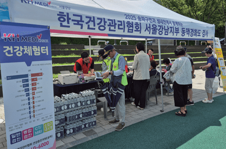 서울강남지부는 8. 7.(목), 송파구 성내천 물빛광장에서 지역 주민을 대상으로 폭염 대응 ‘생수 나눔 캠페인’과 ‘동맥경화도 간이검사’ 건강체험터를 운영했다. 무더위에 취약한 어르신과 주민들의 건강 보호를 위해 생수를 제공하고, 심혈관질환 예방을 위한 간이 건강검사와 건강정보를 안내했다. 앞으로도 강남지부는 예방 중심의 건강관리 등 다양한 프로그램을 확대해나갈 예정이다.
