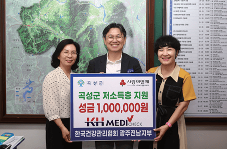 광주전남지부는 8. 4.(월) 곡성군청을 방문해 지역 내 취약계층을 위한 ‘사랑의 성금’을 전달했다. 이번 성금은 소외된 이웃들이 따뜻한 정을 느낄 수 있도록 마련했으며, 저소득 가구에 실질적인 도움이 될 수 있도록 지원할 예정이다. 광주전남지부는 성금 전달뿐만 아니라, 건강 캠페인, 사회공헌 건강검진, 자원봉사활동 등 지역 주민 건강증진을 위해 다양한 사회공헌활동을 꾸준히 이어가고 있다.