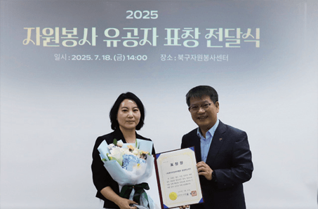 경북지부는 7. 18.(금) 자원봉사 활성화에 기여한 공로를 인정받아 자원봉사 유공자 표창을 수상했다. 이번 표창은 대구광역시장 명의로 수여된 것으로, 지역사회를 위한 꾸준하고 헌신적인 노력을 인정받은 뜻깊은 성과이다. 앞으로도 지역사회와 함께 나눔과 봉사를 실천하며 건강하고 따뜻한 사회 조성에 앞장설 예정이다.