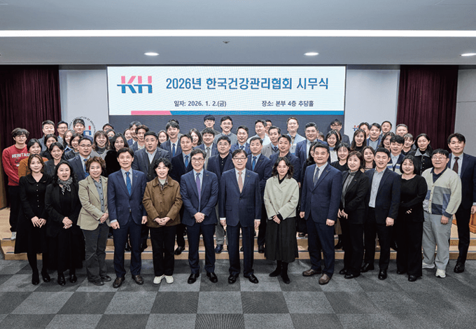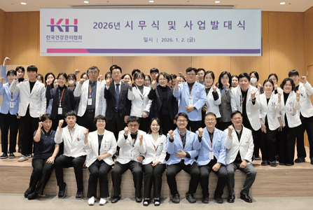 KH건협은 1. 2.(금) 본회 추담홀에서 2026년도 시무식을 개최했다. 김인원 회장은 지난해 마련한 미래 의료의 방향을 바탕으로 올해는 실질적인 성과와 가치를 창출해야 할 때라고 강조했다. 강위중 사무총장은 AI 기반 디지털 의료 환경 선도, 메디체크 앱 고도화, 취약계층 건강 지원 등 3대 핵심 목표에 역량을 집중하겠다고 밝혔다.
